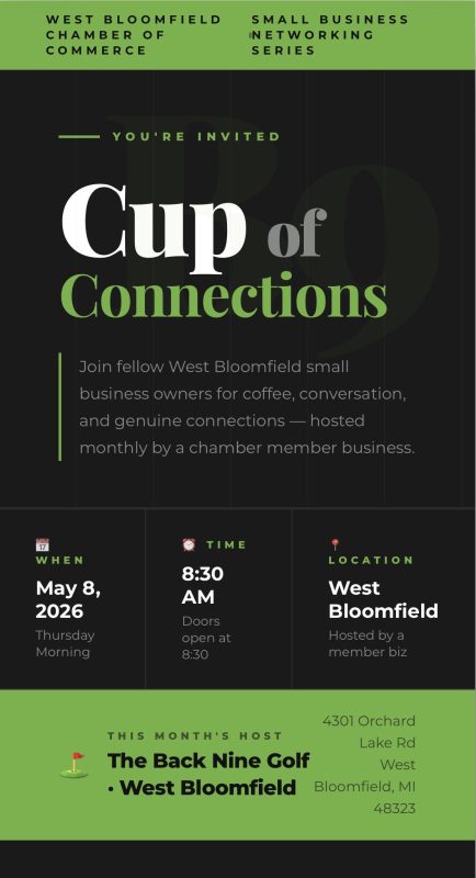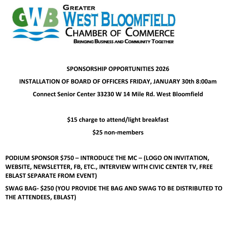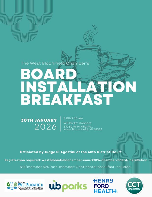 The Greater West Bloomfield Chamber of Commerce is the voice of business for the greater West Bloomfield area, including Sylvan Lake, Keego Harbor and Orchard Lake. The Chamber is a diverse network of businesses and organizations throughout southeastern Michigan and is dedicated to “bringing business and the community together”.